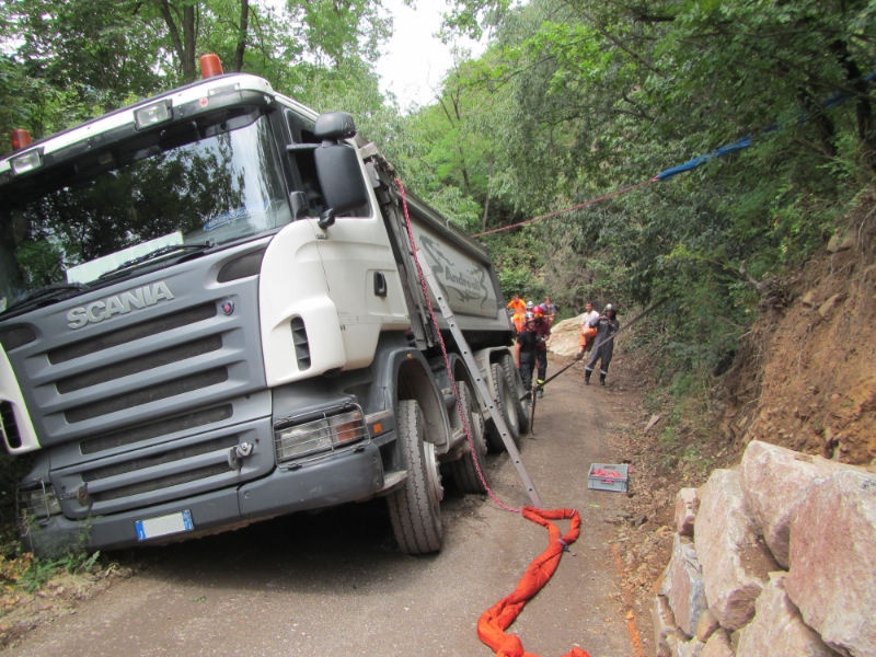 In tarda mattinata , intorno alle ore 11:30 la squadra gru del Corpo Permanente dei Vigili del Fuoco di Bolzano é stata allertata per dare supporto tecnico ai Vigili del Fuoco Volontari di Terlano in intervento sulla strada per Planatsch, sopra alla "Terlaner Weinstube". Un camin carico con 26 tonnellate di asfalto era scivolato oltre il limite della carregiata e rischiava di precipitare. Fino al definitivo recupero del mezzo pesante, il maso sottostante é stato preventivamente evacuato e la strada provinciale é stata chiusa al traffico. Le operazioni di recupero del mezzo sono state rese difficili dal pericolo di caduta sassi e dalla forte pendenza del terreno. Anche la messa in sicurezza del veicolo ha richiesto ore di lavoro a causa della forte pendenza del tratto stradale. É stato necessario assicurare il mezzo preventivamente scaricato tramite dei martinetti per poi recuperarlo con il verricello della gru. Sul luogo sono intervenuti al fianco del Corpo Permanente, i Vigili del Fuoco Volontari di Terlano, Carabinieri, Polizia Municipale di Terlano e Servizio Strade Provinciale.