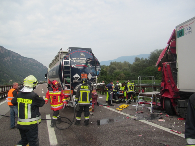 Martedi 30.09.2014 intorno alle ore 14.00 sono stati allertati i vigili del fuoco del Corpo Permanente di Bolzano per un tamponamento tra due camion a rimorchio sull´autostrada del Brennero in corsia nord all´altezza del km. 95.Un camion di nazionalitá italiana ha tamponato un altro camion di origine cieca adibito al trasporto di sostanze pericolose. Il camionista italiano, gravemente ferito, é rimasto incastrato all´interno dell´abitacolo.La sostanza pericolosa trasportata dal camion tamponato (materiale di rifiuto acido) nonostante i danni al rimorchio non é fuoriuscita.Il trasportatore cieco é rimasto invece illeso.