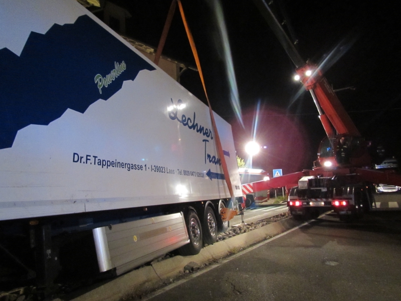 Al termine dei lavori di spostamento della carne si é potuto procedere a riportare il mezzo pesante e il suo rimorchio in posizione di marcia. Per portare a termine l'operazione é stato necessario utilizzare le due autogru del Corpo Permanente dei Vigili del Fuoco di Bolzano. L'automezzo é poi stato affidato al servizio di rimozione.
