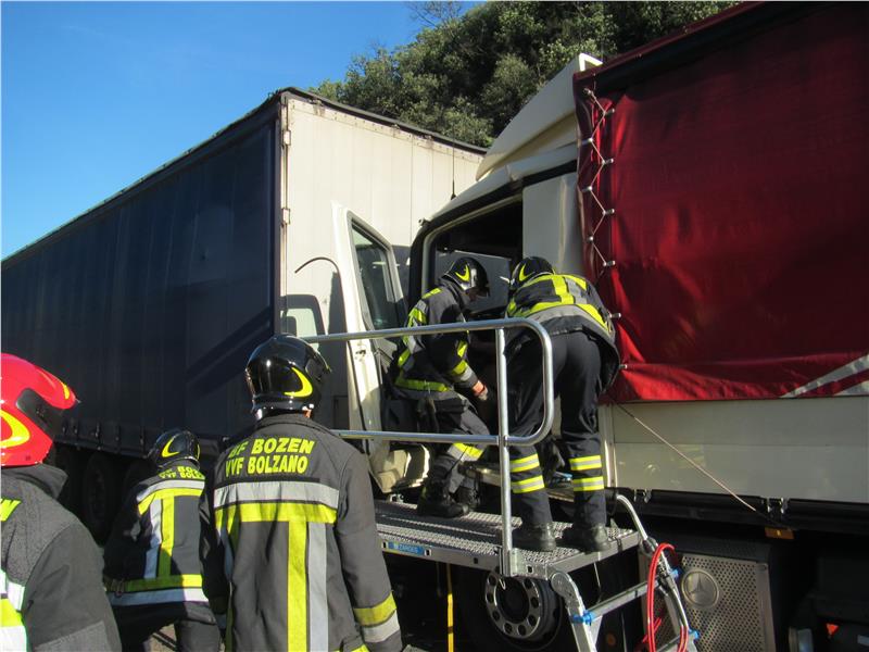 Questa mattina, poco dopo le ore 07:00, il Corpo Permanente dei Vigili del Fuoco di Bolzano è stato allertato per un incidente sull'autostrada con tre camion coinvolti. Sulla corsia Sud, nel tratto di autostrada tra Bolzano Nord e Bolzano Sud, tre automezzi pesanti si sono tamponati. La peggio è toccata al conducente del terzo camion il quale è rimasto incastrato nella cabina. L'uomo è stato liberato mediante l'utilizzo delle apparecchiature idrauliche di soccorso e in seguito è stato preso in cura dal medico d'urgenza del Pelikan 1. Durante tutta la durata dell'intervento la persona è rimasta cosciente e dai primi accertamenti si è potuto stabilire che ha subito solo ferite lievi o di media entità. Durante le operazioni di soccorso la corsia Sud dell'autostrada è rimasta completamente chiusa. In intervento, insieme ai Vigili del Fuoco del Corpo Permanente di Bolzano, erano presenti i Vigili del Fuoco Volontari di Cardano, il servizio sanitario e la Polizia Stradale.