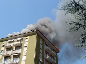 Foto VVF BolzanoSabato pomeriggio un’enorme colonna di fumo era visibile da tutta la città. All’incrocio tra la via Vicenza e la via Verona bruciava il tetto di un edificio di sei piani.