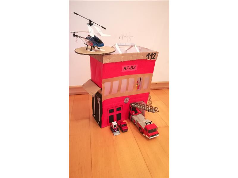 Raphael von Gelmini, 12 anni, di San Michele/Appiano, ha realizzato il suo desiderio professionale: una "borsa da caserma per pompieri professionisti". Ha progettato la "facciata" con la carta sul modello della caserma dei Vigili del Fuoco Permanenti di Bolzano, con grandi aperture per i portoni per il passaggio dei mezzi dei vigili del fuoco. Dietro le grandi "finestre", coperte da pellicola trasparente, un pompiere giocattolo si lascia scivolare lungo la ricarica di una penna a sfera. Sul fronte dell'edificio, sopra il logo del Corpo Permanente, è visibile a grandi cifre il numero di emergenza 112. Sul tetto, c'è una grande antenna radio fatta di filo metallico e una piattaforma in cartone di atterraggio per elicotteri. Sulla lato lungo, i "tubi flessibili" sono appesi per l'asciugatura su rotoli, realizzati tramite rocchetti di filo riciclati di una macchina da cucire. Il tetto soprastante è fissato con graffette. Sull'altro lato è stata realizzata una parete di pratica per arrampicata per i pompieri - con gli appigli fatti in plastilina colorata e una scala per scendere. L'alunno si ricordava di tutti questi dettagli da una visita che aveva svolto presso la Caserma dei vigili del fuoco l'anno scorso.