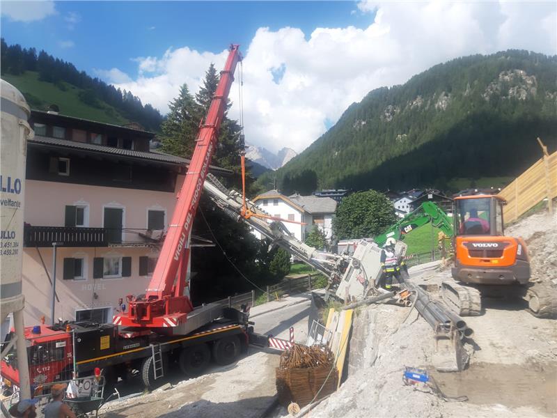 Oggi 28.07.2020 alle ore 14:06 la squadra autogrú del Corpo Permanente dei Vigili del Fuoco di Bolzano, é stata chiamata in intervento in via Plan da Tieja n. 57 a Selva Gardena, nei pressi dell'Hotel Bel Mont. Una macchina perforatrice cingolata del peso di 23 tonnellate, si é pericolosamente inclinata danneggiando la struttura del tetto ed un balcone dell'Hotel, durante i lavori di consolidamento del terreno, nel cantiere adiacente. Fortunatamente non si sono registrati feriti. Sul posto oltre alla squadra autogrú del Corpo Permanente VVFBZ, anche i Vigili del Fuoco volontari di Selva Gardena con 18 uomini ed un'autoscala, i Carabinieri come anche la Polizia Locale.