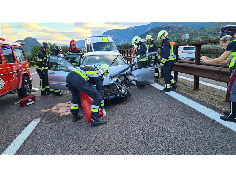 Sta mattina verso le ore 06:30 questo corpo permanente dei vigili del fuoco è stato chiamato per un grave incidente in autostrada all`altezza del chilometro 102! Una persona è rimasta incastrata nella propria autovettura e ha dovuto essere estratto con pinze idrauliche! Dopo la estrazione è stata portata con l`elicottero al ospedale di Bolzano! Una seconda persona è stata portata con l'ambulanza al ospedale!