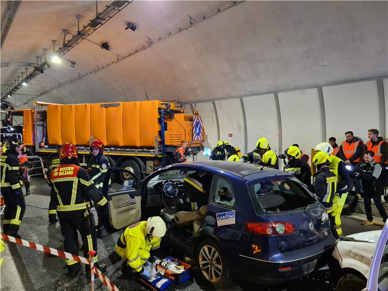Sono le 22.26 di martedì sera: nella canna sud della Galleria del Virgolo un camion sbanda e si posiziona trasversalmente rispetto alla carreggiata. Un’auto frena bruscamente, nel tentativo di evitare l’impatto ma un’altra la tampona violentemente. Il traffico si blocca, un uomo esce da un mezzo e dopo aver raggiunto una delle colonnine Sos presenti lungo la Galleria dà l’allarme al CAU, Centro Assistenza Utenti dell’A22. È l’avvio della macchina dei soccorsi: in meno di 8 minuti gli ausiliari di A22 e la pattuglia della Polizia Stradale sono sul posto. A seguire arrivano tutti, Vigili del Fuoco volontari di Cardano, permanenti di Bolzano e sanitari. E nel giro di 40 minuti le prime ambulanze escono dirette all’ospedale. Anche se era solo un’esercitazione si è svolto tutto come se fosse vero, con i feriti immobilizzati in auto e il tratto dell’arteria chiusa. E tutto ha funzionato alla perfezione.