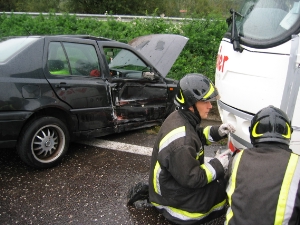 L'autovettura, sbandando verso il centro della carreggiata ha strisciato col fianco sinistro il guard rail. Successivamente andava a sbattere contro un autobus carico di turisti germanici.