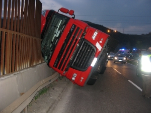 Sabato 26 marzo 2011 poco prima delle ore 19.00 nella curva sinistrorsa che precede il cavalcavia dell’autostrada A22 in direzione via Einstein in zona industriale di Bolzano si rovesciava, sul lato destro, un camion autoarticolato frigorifero di una ditta di trasporti della Bassa Atesina. Immediatamente venivano chiamati sul posto il corpo permanente dei vigili del fuoco di Bolzano con la squadra autogru e la Croce Rossa. L’autista rimaneva ferito lievemente alla mano. Il camion trasportava 22 tonnellate di carne di maiale. In conseguenza del blocco stradale in zona industriale si creavano code di autoveicoli poi regolate dalla Polizia municipale di Bolzano che provvedeva a deviare il traffico. I lavori di scarico della carne dal semirimorchio proseguivano per diverse ore sotto la sorveglianza del veterinario reperibile di turno. Di rinforzo alle operazioni di scarico venivano allertati i vigili del fuoco volontari di Bolzano e Gries. Solo verso le 03.00 del mattino di domenica 27 marzo si poteva sollevare il mezzo incidentato, liberato del suo carico, con l'autogru dei vigili del fuoco.