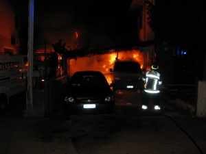 Incendio di varie autovetture parcheggiate sotto una tettoia