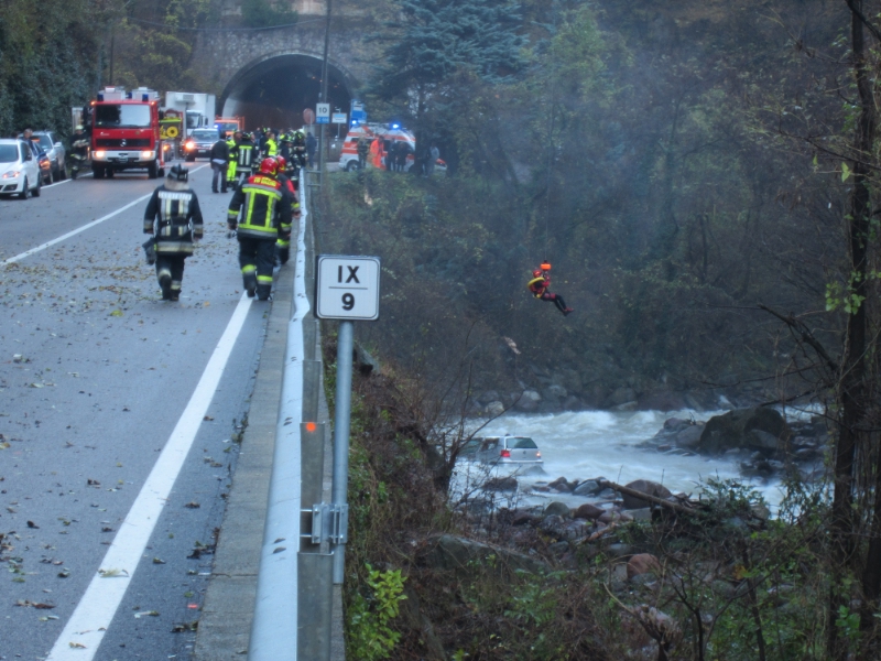 Intorno alle ore 08:30 del 13.11.2012 ,la squadra di Soccorso Fluviale e l'autogru del Corpo permanente dei Vigili del Fuoco di Bolzano, sono stati allertati per un incidente stradale in Val Sarentino. Allertati anche i Vigili del Fuoco Volontari di Sarentino e Campolasta, i Volontari di Südtiroler Wasserrettung e Bezirktaucher. Poco prima della localitá Mezzavia, per cause ancora poco chiare, un'autovettura é uscita di strada ed é precipitata nel letto del torrente Talvera che in questi giorni ha una grossa portata d'acqua. La persona che si trovava ancora all'interno dell'auto é stata portata in salvo con il verricello dell'elicottero di soccorso Pelikan1, a bordo del quale sono stati imbarcati due soccorritori fluviali del Corpo Permanente dei Vigili del Fuoco, trasportati direttamente sul posto. Nonostante la complessa dinamica dell'incidente, la persona ha riportato soltanto ferite lievi ed ha ricevuto le prime cure dal medico del Pelikan1 ed é stata in seguito condotta in Ospedale da un ambulanza della Croce Bianca per effettuare dei controlli. Tramite l'ausilio di un'autogru é stata in seguito recuperata l'automobile dal letto del torrente. Durante le operazioni la strada é rimasta chiusa per circa un'ora e mezza