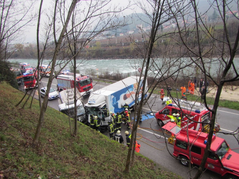 Intorno alle ore 10:15 il Corpo Permanente di Bolzano riceveva una chiamata di soccorso per un grave incidente stradale sulla strada tra Bolzano e Cardano dove erano coinvolti due camion.