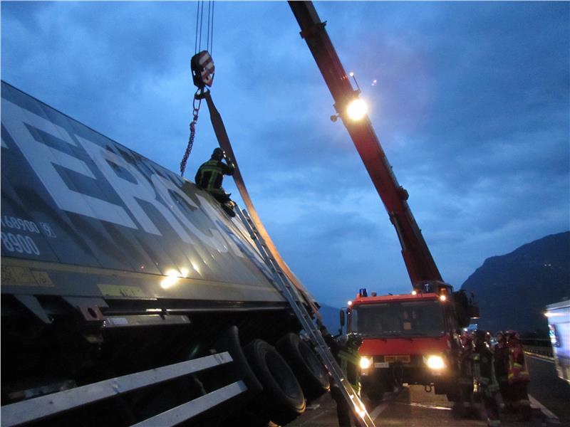 Verso le 19:05 il Corpo Permanente dei Vigili del Fuoco di Bolzano è stato allarmato per un recupero di un camion, che si era ribaltato sul A22 km 91. Arrivati sul posto la squadra ha trovato il rimorchio di un camion, che era appoggiato sul guardrail laterale su un ponte, che attraversa l’Adige.