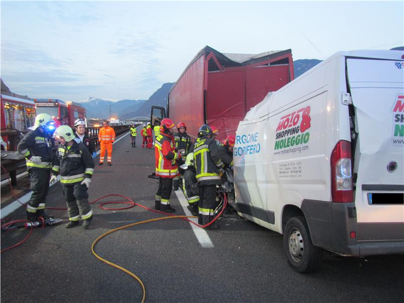 Intorno alle ore 16:00 di oggi 11.12.2019 i Vigili del fuoco permanenti di Bolzano sono stati chiamati oggi di nuovo per un tamponamento sulla corsia nord della autostrada A22 del Brennero, al km 93. Un furgone ha tamponato il semirimorchio di un autoarticolato ed è rimasto incastrato. I vigili del fuoco hanno dovuto prima disincagliare il furgone dal semirimorchio per poi poter estrarre il conducente dal furgone.
