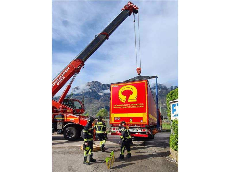 L'autoarticolato era uscito di strada durante una manovra ed era rimasto bloccato nel fango. Poiché il semirimorchio bloccava tutta la strada, si decideva di intervenire utilizzando l'Autogru. In collaborazione con i Vigili del Fuoco Volontari di Terlano, il mezzo pesante veniva riportato sulla sede stradale, consentedogli così di proseguire il suo viaggio.