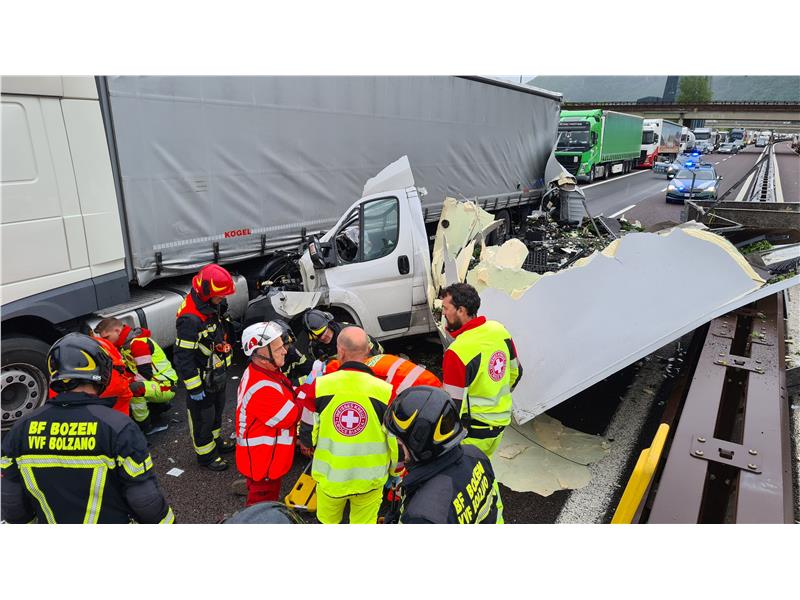 In seguito a un grave incidente stradale nella tarda mattinata, il conducente di un furgone è rimasto incastrato nel suo veicolo. Il furgone aveva tamponato un mazzo pesante e di seguito catapultato lateralmente sul guardrail centrale. La corsia nord e la corsia di sorpasso della corsia sud sono state bloccate dall'incidente. La liberazione e le prime cure dell'autista infortunato sono state effettuate dall'equipaggio dei Vigili del Fuoco del Corpo permanente di Bolzano. Dopo l'approvvigionamento e la consegna al medico di emergenza e i soccorritori della Croce Rossa arrivati sul posto, il veicolo è stato recuperato e le parti del veicolo e il carico sono stati rimossi insieme al personale dell'autostrada. I rilievi dell’incidente sono stati fatti dalla polizia stradale. Il blocco totale della corsia nord e il blocco parziale della corsia sud hanno causato notevoli problemi di traffico sull'autostrada.