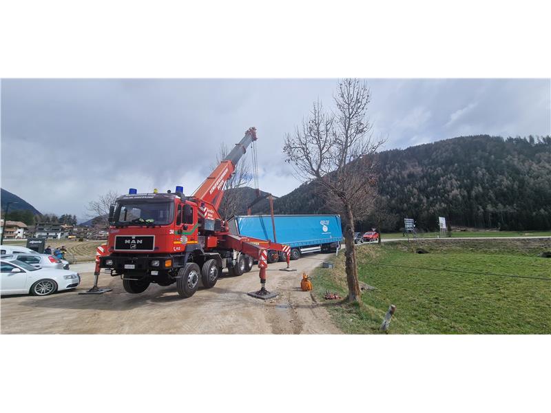 Un semirimorchio è uscito da una strada sterrata nei pressi di Rasun di Sotto e ha dovuto essere recuperato dal Corpo Permanente dei Vigili del Fuoco.
