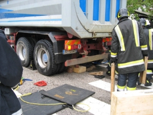 FOTO BFBZ - VVFBZNel pomeriggio del 11.10.2004 i Vigili del Fuoco del Corpo Permanente di Bolzano sono intervenuti a Frangarto per un grave incidente stradale. Una giovane donna è stata travolta da un camion rimanendo incastrata sotto l'asse posteriore. Mentre veniva chiamato sul posto il medico d'emergenza della Croce Bianca per constatarne il decesso, i Vigili del Fuoco del Corpo Permanente di Bolzano coadiuvati dai Vigili del Fuoco Volontari di Frangarto hanno estratto la donna con l'ausilio dei cuscini pneumatici. Sul posto sono intervenuti anche i Carabinieri di Appiano.